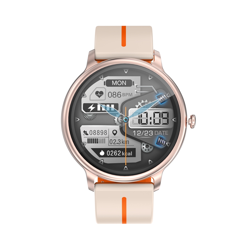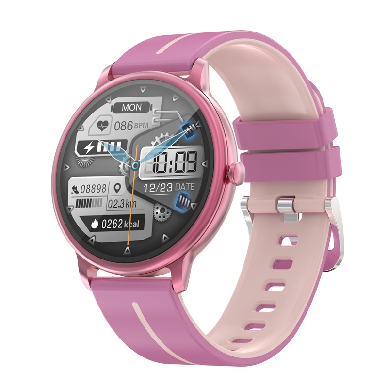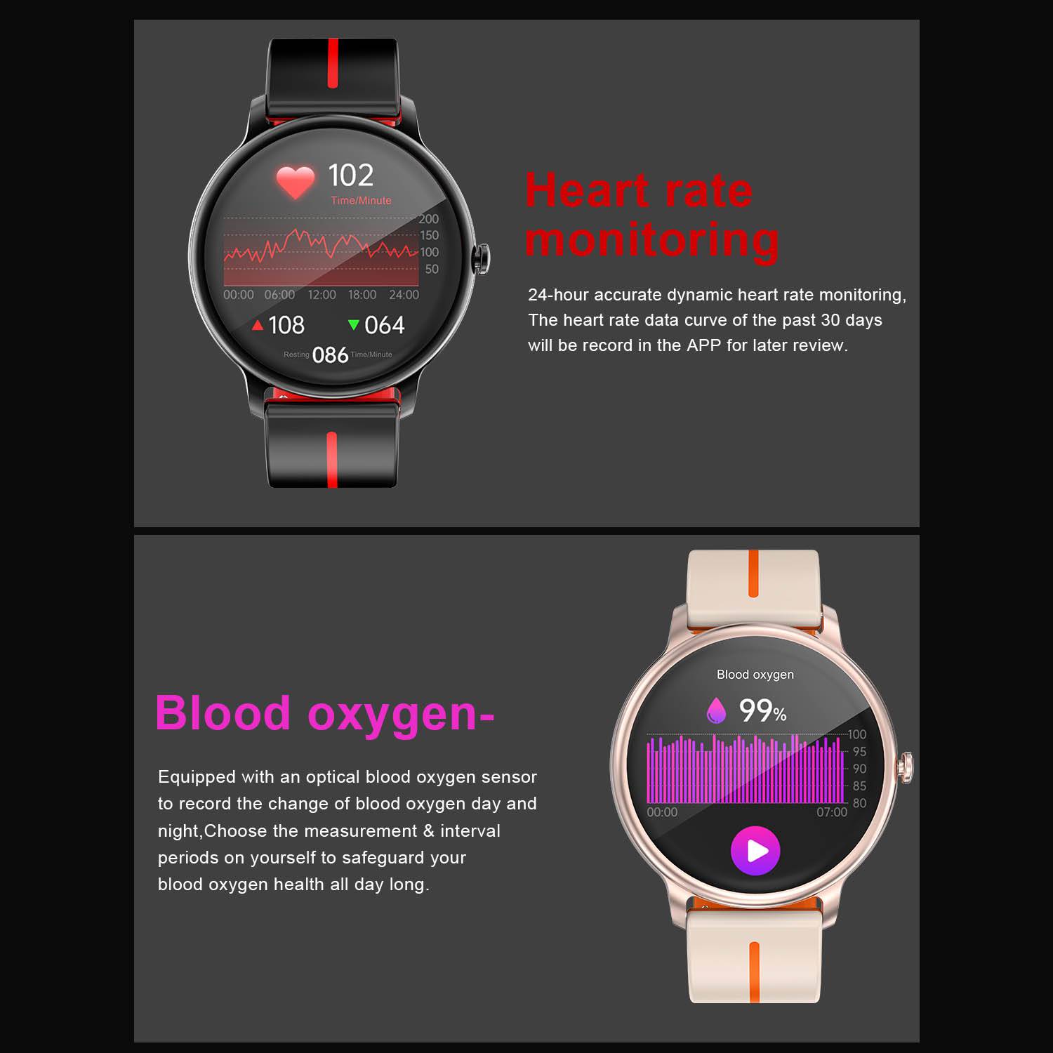 A combination of charm and quality. Fashionable styles and stylish. 1.28 inches amoled high-definition color screen and High definition call time online. Blood pressure and oxygen monitoring. 100+ multiple bulit-in dials. Sports mode. Long-lasting battery life.