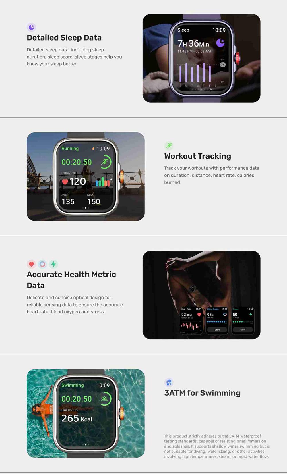 1.83-inch high-definition touch screen, four-sided narrow border design. 24/7 health monitoring, heart rate, blood pressure, sleep, blood oxygen. 100+ sports modes. Waterproof IP67. High fidelity 3D sound qualuty. 10 days of strong battery life.