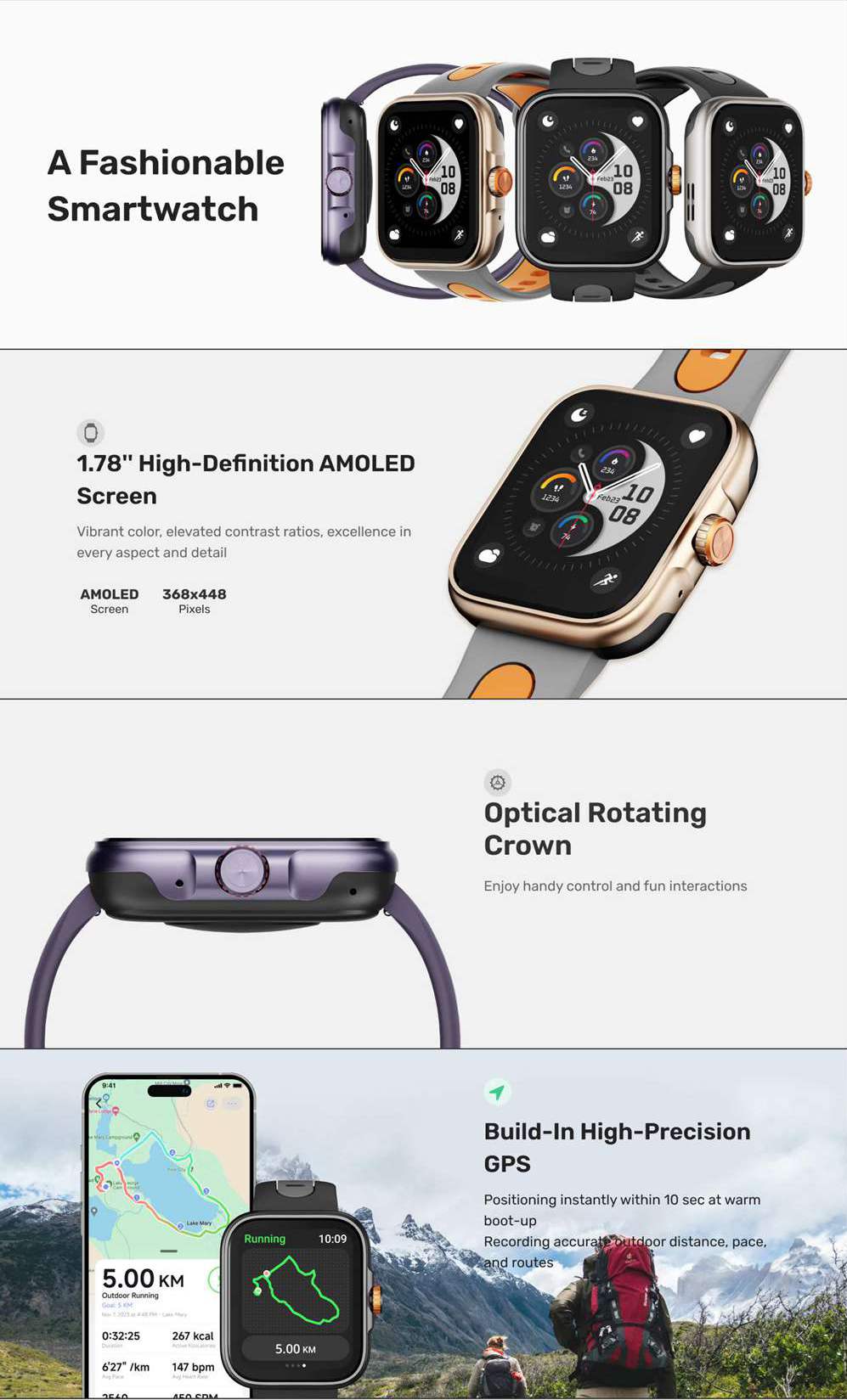 The smart watch S216 features a 1.78-inch high-definition AMOLED screen that offers vibrant colors and elevated contrast ratios, presenting excellence in every aspect and detail. With a built-in high-precision GPS, it can achieve instant positioning within 10 seconds at warm boot-up, accurately recording outdoor distance, pace, and routes. Its delicate and concise optical design ensures relable sensing data, providing accurate health metric readings such as heart rate, blood oxygen, and stress levels. The watch also boasts an impressive long battery life, lasting 5 days with the always-on display and up to 12 days under normal use. Additionally, it comes with exquisite watch faces, including customizable, photo, and always-on options, designed by elite global designers and constantly updated to keep up with the latest styles.