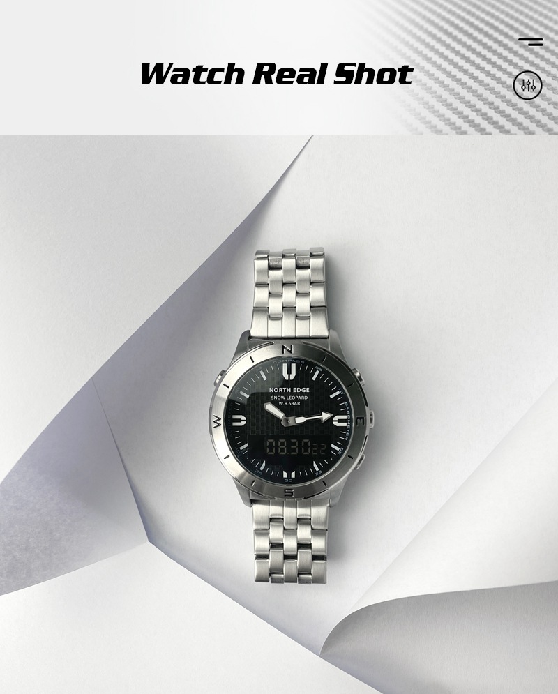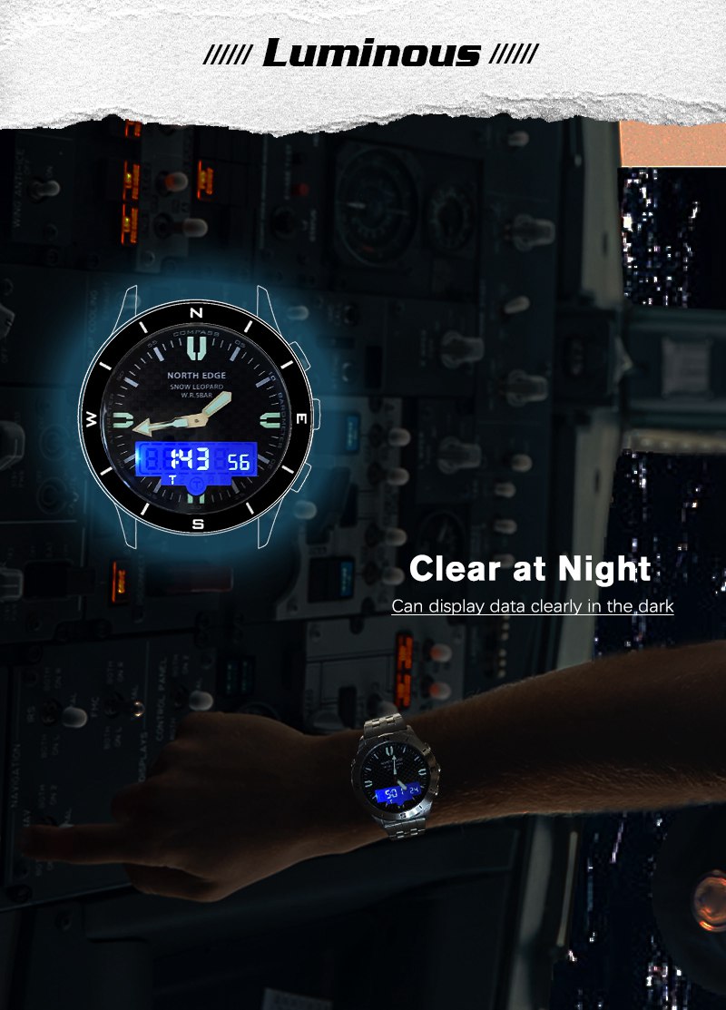 North Edge solar-powered watch Photon, which harnesses sunlight for energy. Solar powered, absorbing visible light, even the faintest source provides ample power. Your unwavering companion through highs and lows; Driving energy innovation, steering into the future, and radiating conviction. Safe and Eco-friendly luminous material, fearless of the night, advancing confidently.