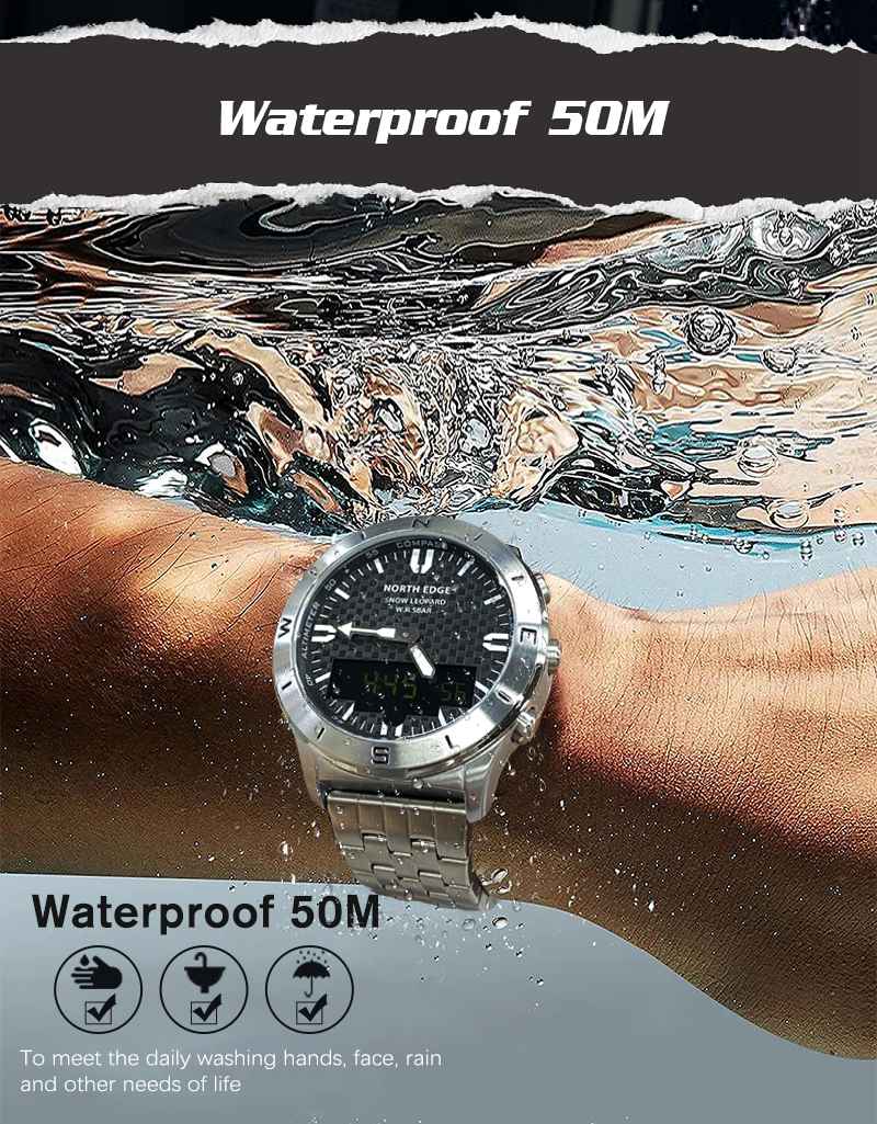 North Edge solar-powered watch -- EVOQUE 2. Featuring solar drive movement technology, EVOQUE 2 harnesses the power of sunlight to ensure consistent and eco-friendly operation. With 304 stainless steel cover, it's built to withstand the rigors of everyday wear. Plus, with a waterproof rating of 50 meters, you can confidently take it on all your aquatic adventures.