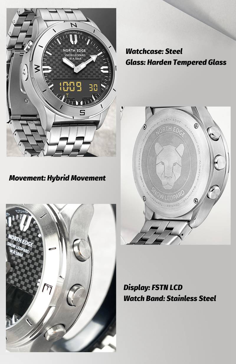 The Execellent outdoor adventure watch -- Snow leopard. The entire watch is made of all metal, integrating the main outdoor functions into a solid structure. It is combined with an altimeter, barometer, compass and thermometer to transform into an excellent adventure equipment.