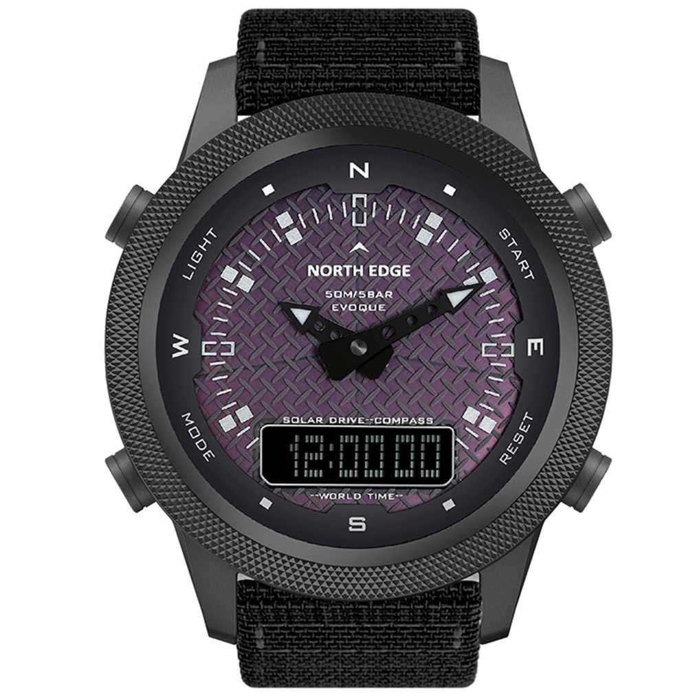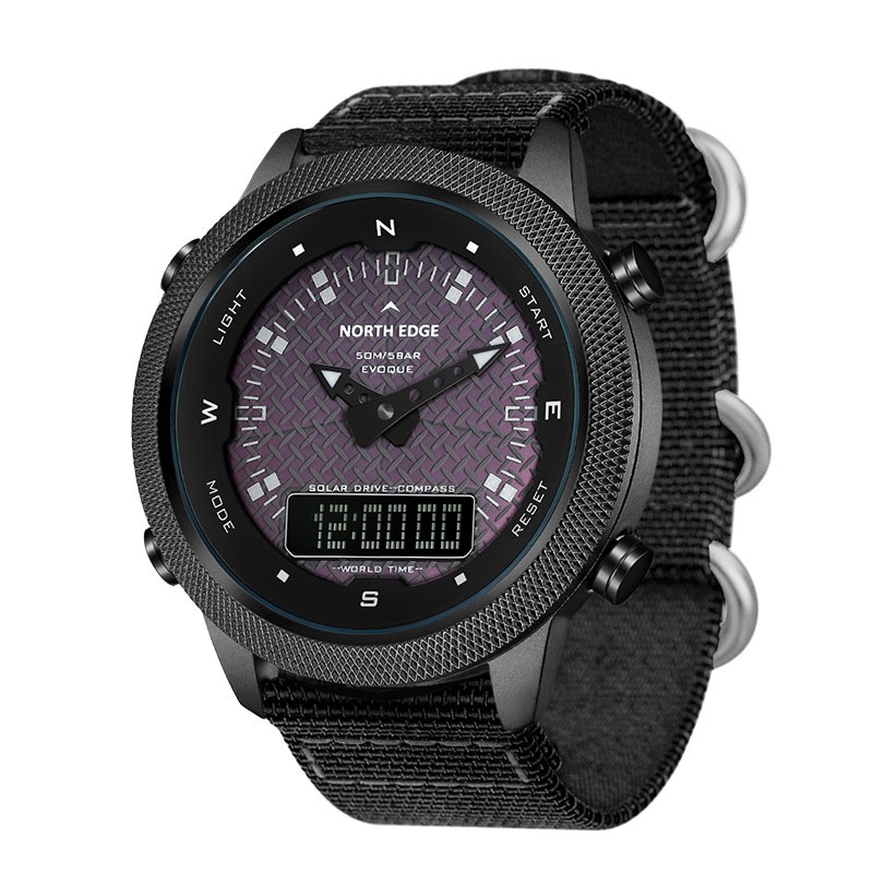 North Edge solar-powered watch -- EVOQUE 2. Featuring solar drive movement technology, EVOQUE 2 harnesses the power of sunlight to ensure consistent and eco-friendly operation. With 304 stainless steel cover, it's built to withstand the rigors of everyday wear. Plus, with a waterproof rating of 50 meters, you can confidently take it on all your aquatic adventures.