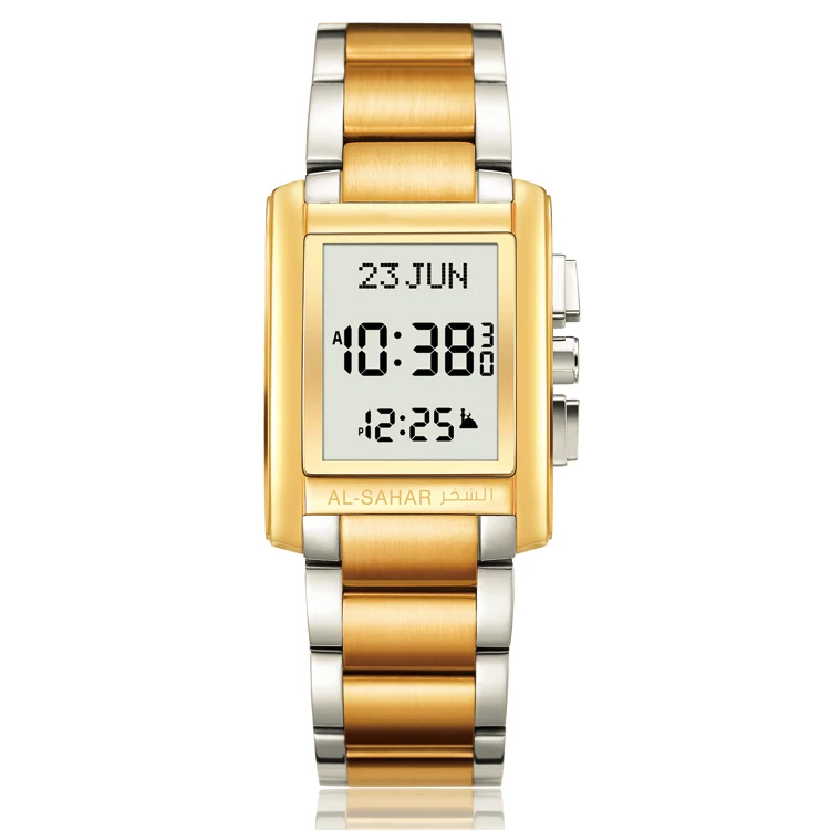 The extraordinary Azan timepiece amalgamates the practicality of a modern timekeeping instrument with the indispensable attributes indispensable to devout adherents of Islam. Furthermore, this watch encompasses utilitarian features like an alarm, stopwatch, and calendar, transcending its role beyond that of a mere prayer aid.
