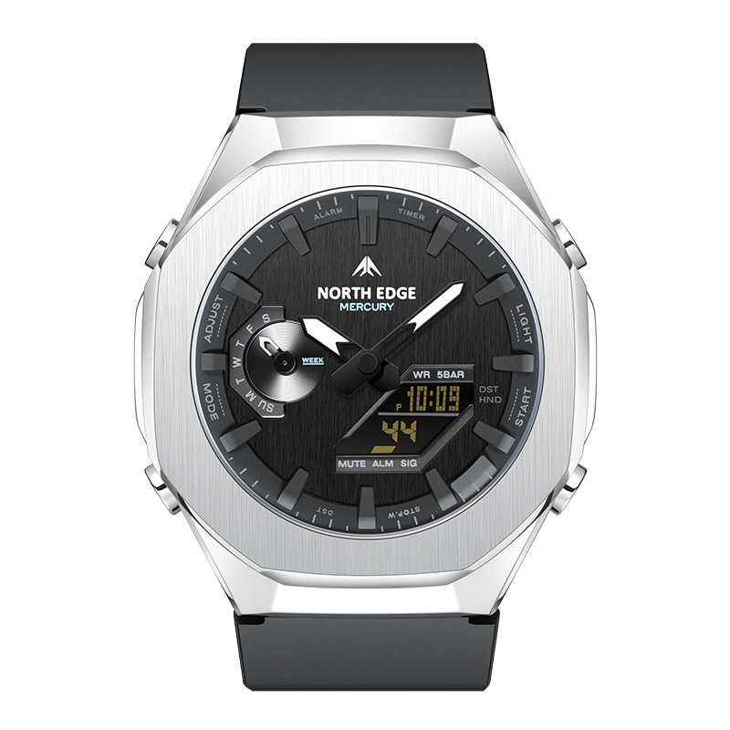 Mercury Outdoor Watch is built for bold explorers. Rugged metal case, raised markers, and 3D hands keep analog and digital time perfectly synchronized. Five alarms, countdown, stopwatch, and 24-zone world time keep you on schedule. Luminous hands, LED backlight, and 5ATM water resistance ensure visibility and durability in any outdoor adventure.