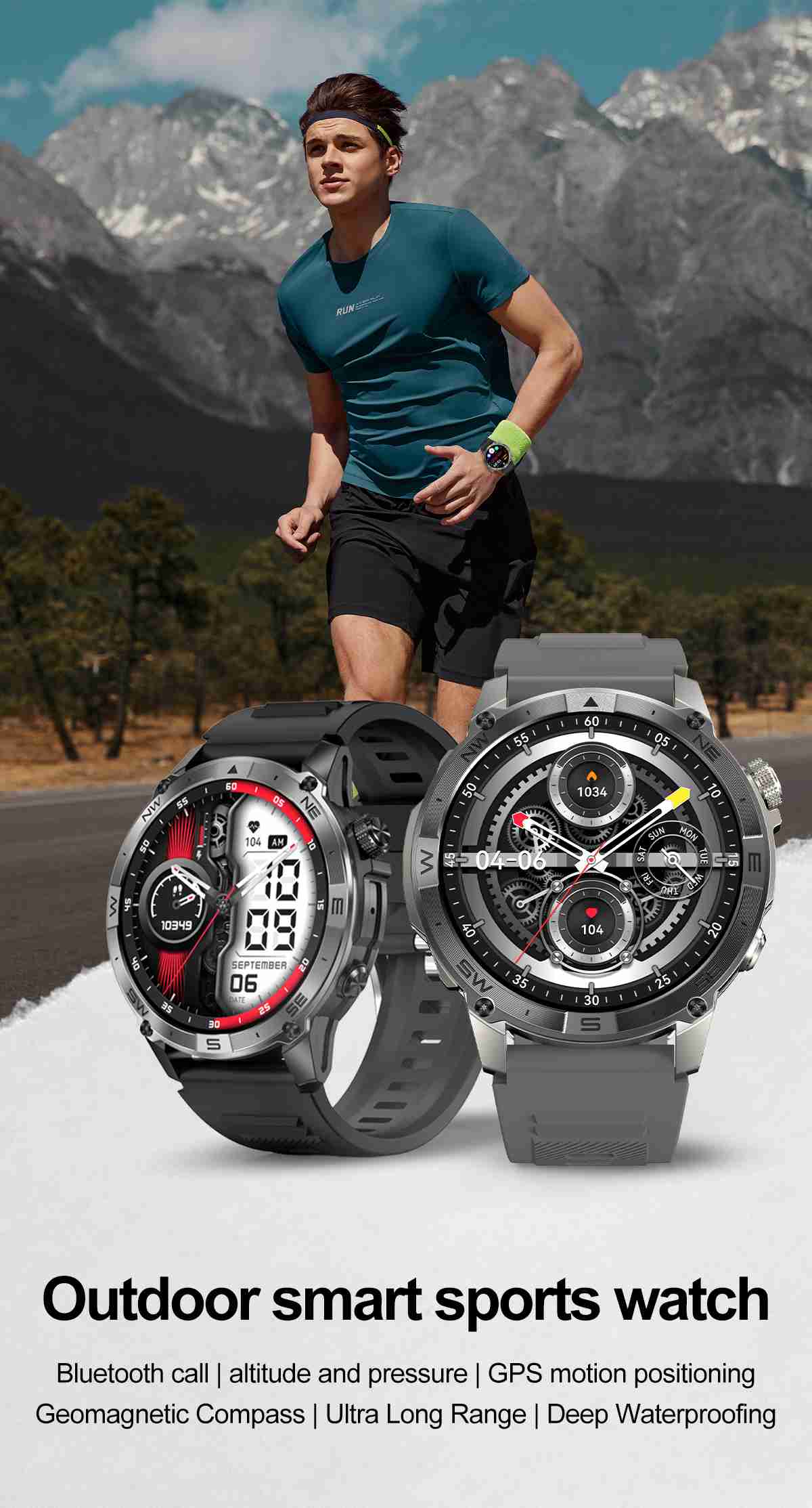 Outdoor sport watch. GPS motion positioning for safe return journey. Compass in outdoor adventure. offline map, travel without getting lost. 1.43'' Amoled display screen. Bluetooth calling. IP68 waterproof. Health monitoring. Local music storage control. Long term endurance and large capacity configuration.