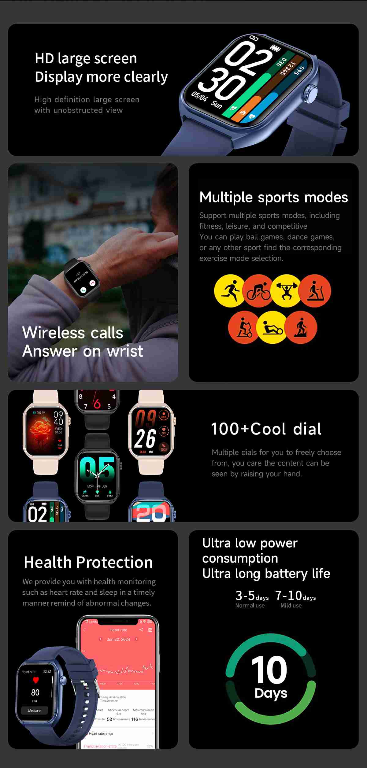 The smart watch DA03 —built for durability with dust-proof, antifreeze, and high-temperature resistance. Enjoy seamless Bluetooth calls with HD waterproof speakers, keeping you connected hands-free.Track workouts in multiple sports modes, including hiking and cycling, with real-time data to stay on target. Monitor heart rate, blood oxygen, and sleep quality for smarter health insights.Customize your look with interchangeable watch faces—classic, sporty, or modern. Get instant call and message alerts (WeChat, QQ) so you never miss important updates.