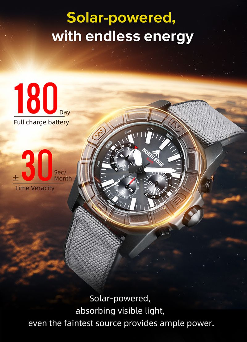 This solar-powered watch--Engineered for the modern explorer, the North Edge Blaze redefines outdoor timekeeping with its revolutionary photovoltaic power system, delivering an industry-leading 180-day battery life on a single charge. This rugged timepiece combines cutting-edge functionality with bold aesthetics through its triple chronograph system and "Born Dynamic" design philosophy, ensuring precision tracking of your most demanding adventures.The Blaze excels in low-light conditions with its Clear At Night luminous technology, while its 50m waterproof rating guarantees reliable performance in rain, swims, and extreme conditions. Whether you're scaling mountains or navigating urban jungles, this watch adapts seamlessly to your active lifestyle.