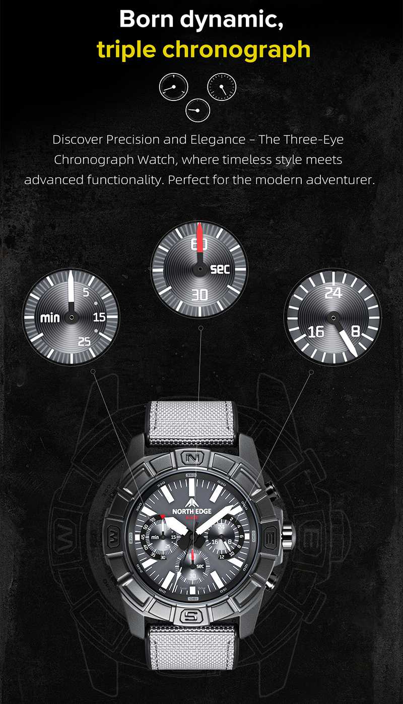 North Edge LONG WINGS solar - powered watch! It's a game - changer with a 180 - day full - charge battery life. With time accuracy of 30 seconds per month, triple chronograph, and 50M waterproofing, it's both practical and reliable. Its clear - at - night display ensures easy viewing. Made of 316 stainless steel, it's durable and stylish. The tri - fold clasp adds a touch of convenience.